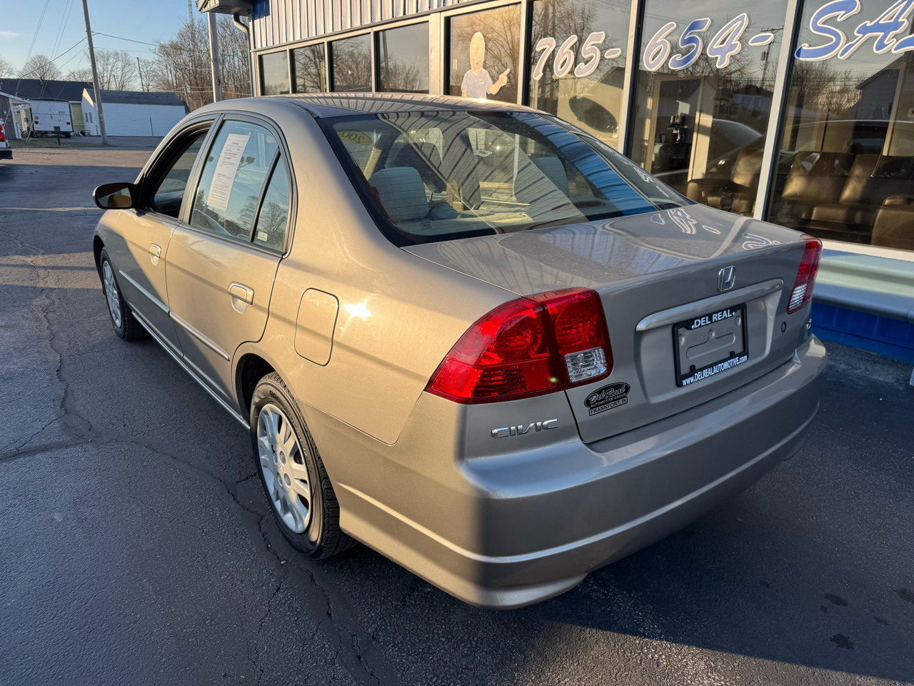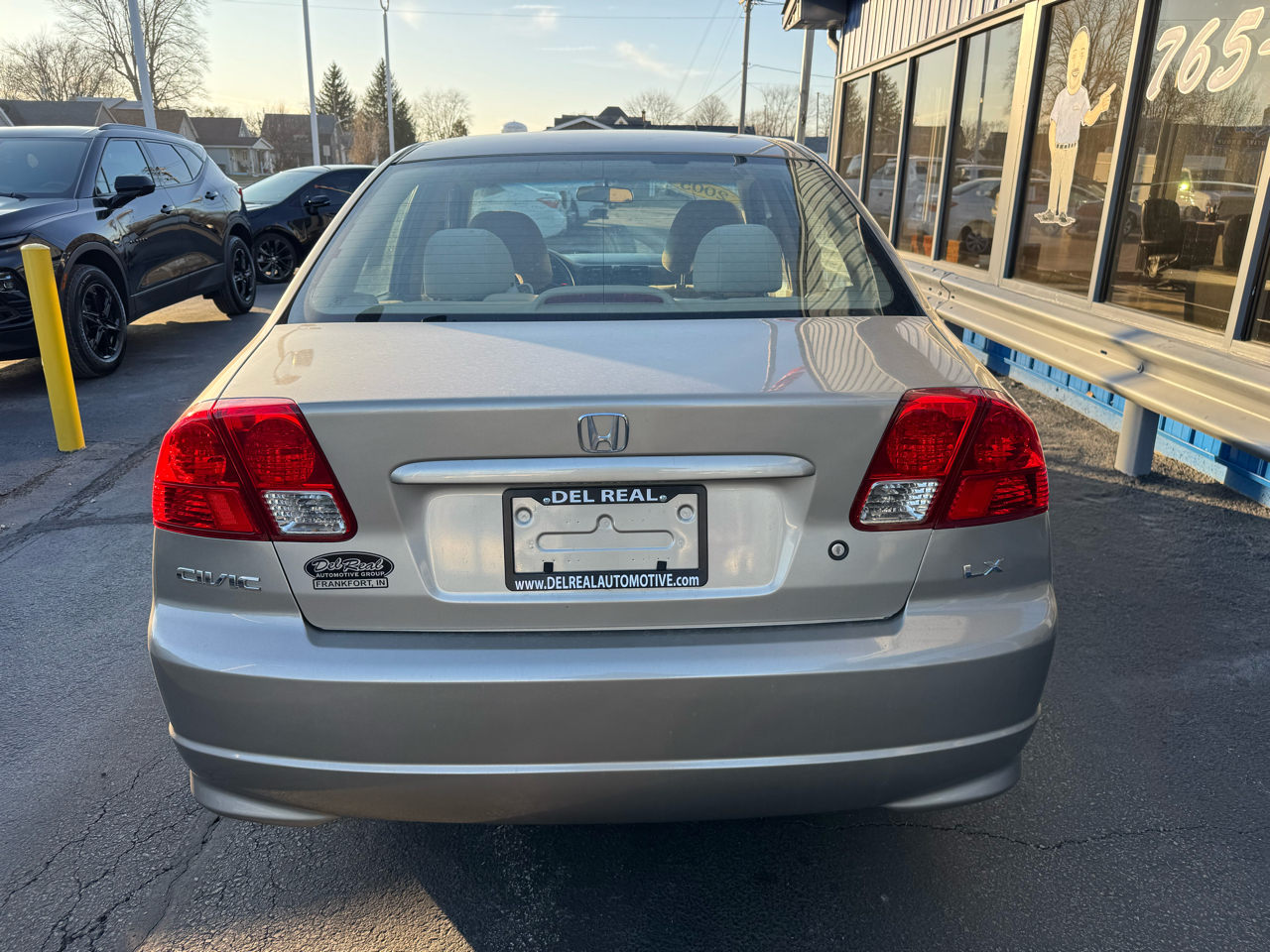 Clean CARFAX. 2005 Honda FWD Civic LX 4-Speed Automatic with Overdrive Gold Odometer is 84566 miles below market average! 15" Wheels w/Full Covers, 4 Speakers, Air Conditioning, AM/FM radio, AM/FM Stereo w/CD, Clock & 4 Speakers, Bodyside moldings, Bumpers: body-color, CD player, Cloth Seat Trim, Driver door bin, Driver vanity mirror, Dual front impact airbags, Four wheel independent suspension, Front anti-roll bar, Front Bucket Seats, Front Center Armrest, Front reading lights, Illuminated entry, Panic alarm, Passenger door bin, Passenger vanity mirror, Power door mirrors, Power steering, Power windows, Rear anti-roll bar, Rear window defroster, Remote keyless entry, Speed control, Speed-sensing steering, Split folding rear seat, Tachometer, and Tilt steering wheel. 29/38 City/Highway MPG PROUDLY SERVING CENTRAL INDIANA ( Frankfort, Lafayette, Crawfordsville, Noblesville, Lebanon, Indianapolis, Anderson, Fort Wayne, Elwood, Logansport and many others.) FOR OVER 30 YEARS! Selling used, Preowned and Certified vehicles some under 10k and under 5k. GM Ford Chrysler Dodge, Chevy Pontiac, Buick, Honda, Toyota, Nissan, Kia ,F150, Silverado and many more!! Some cars under 10k and even 5k.Visit Del Real Automotive Group Inc. online at www.delrealautomotive.com to see more pictures of this vehicle or call us at 1-877-886-7847 today to schedule your test drive.