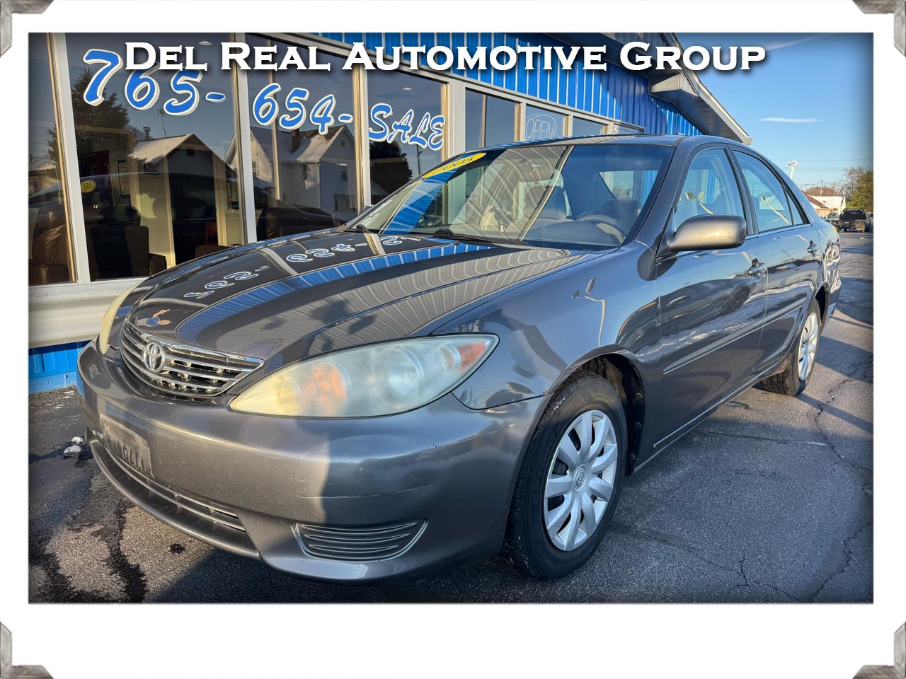 Recent Arrival! 2005 Toyota FWD Camry LE 5-Speed Gray Odometer is 28666 miles below market average! 6 Speakers, 6.5JJ x 15 Steel Wheels, ABS brakes, Air Conditioning, AM/FM radio, Bodyside moldings, Bumpers: body-color, CD player, Cloth Seat Trim, Driver door bin, Driver vanity mirror, Dual front impact airbags, Four wheel independent suspension, Front anti-roll bar, Front Bucket Seats, Front Center Armrest w/Storage, Front reading lights, Fully automatic headlights, Illuminated entry, Outside temperature display, Overhead console, Panic alarm, Passenger door bin, Passenger vanity mirror, Power door mirrors, Power driver seat, Power steering, Power windows, Rear anti-roll bar, Rear seat center armrest, Rear window defroster, Remote keyless entry, Speed control, Speed-sensing steering, Split folding rear seat, Steering wheel mounted audio controls, Tachometer, Tilt steering wheel, and Variably intermittent wipers. Awards: * 2005 KBB.com 10 Best Used Cars Under $8,000 PROUDLY SERVING CENTRAL INDIANA ( Frankfort, Lafayette, Crawfordsville, Noblesville, Lebanon, Indianapolis, Anderson, Fort Wayne, Elwood, Logansport and many others.) FOR OVER 30 YEARS! Selling used, Preowned and Certified vehicles some under 10k and under 5k. GM Ford Chrysler Dodge, Chevy Pontiac, Buick, Honda, Toyota, Nissan, Kia ,F150, Silverado and many more!! Some cars under 10k and even 5k.Visit Del Real Automotive Group Inc. online at www.delrealautomotive.com to see more pictures of this vehicle or call us at 1-877-886-7847 today to schedule your test drive.